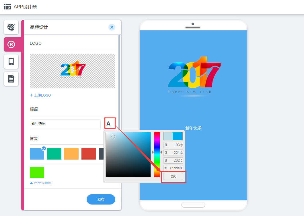 点击色板可调整背景颜色,除此之外,可上传自定义图片作背景图片,点击发布按钮即可。如下图所示: